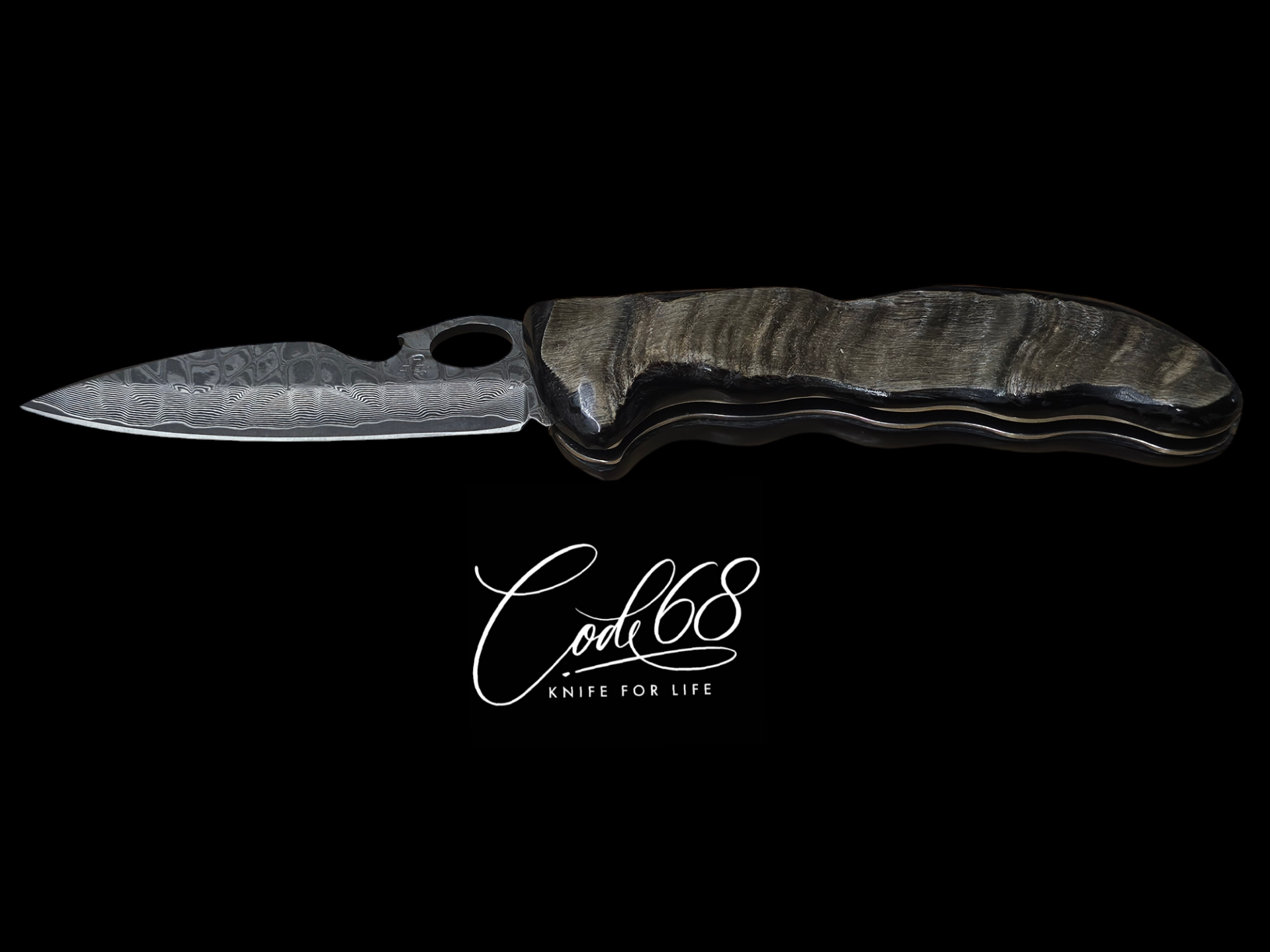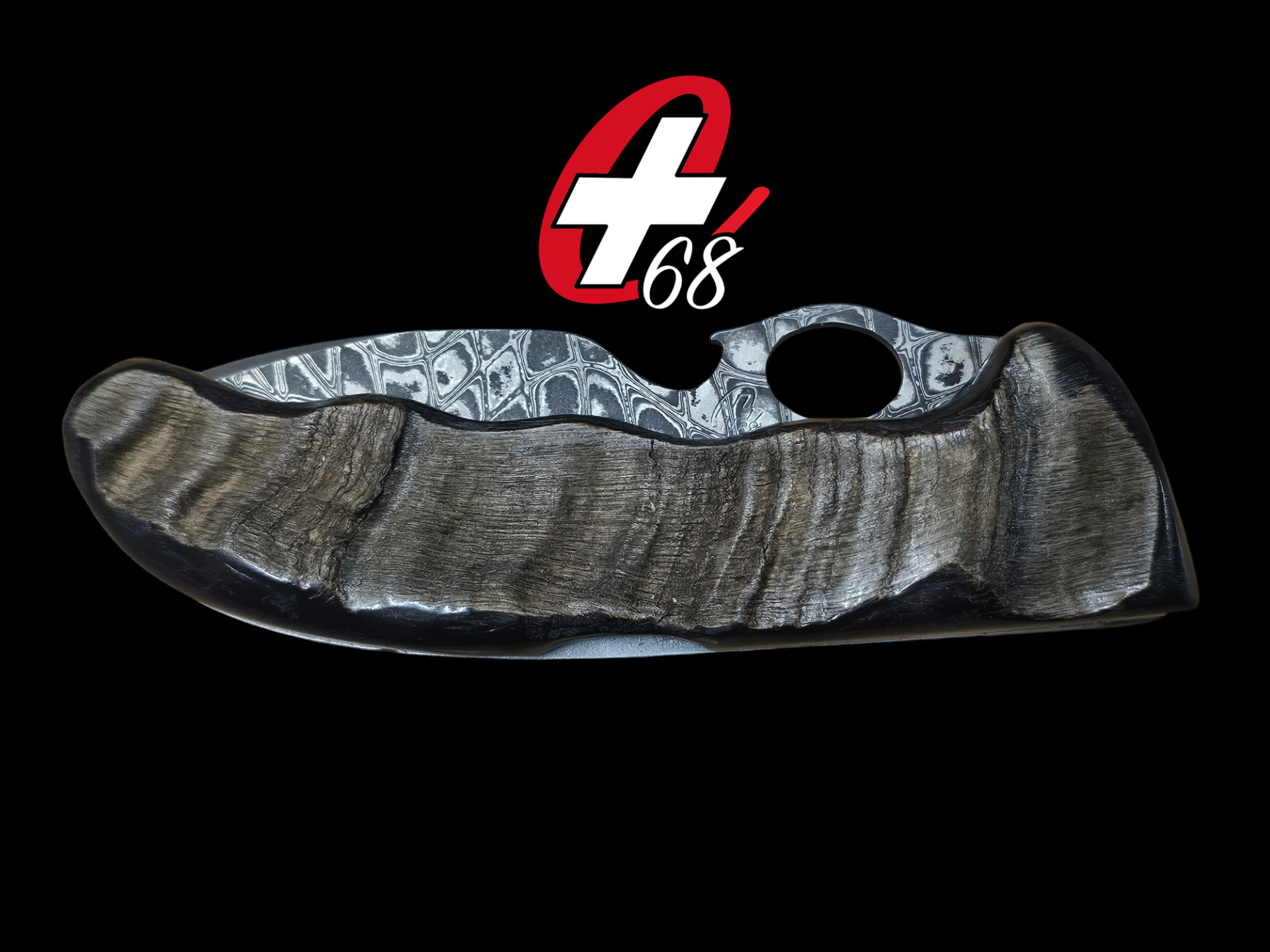 Das einzigartige Hunter Pro mit Steinbockhorn Schalen ist ein Unikat. Die Damastklinge ist mit einem Flaschöffner auf dem Klingenrücken versehen. Es ist ein Inox Sandwich Damast mit Mittellage. Die Steinbockhornschalen gaben dem Messer eine einzigartiges Erscheinen