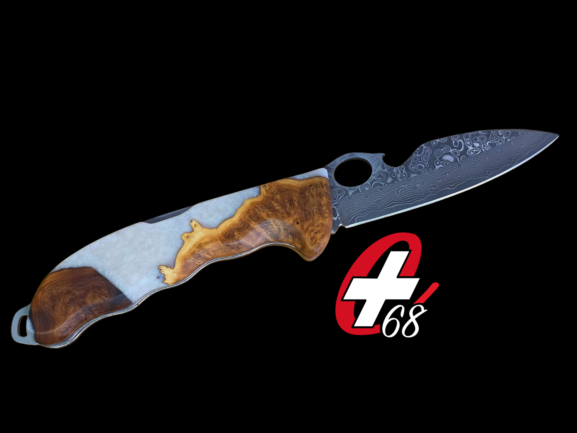 Das Messer hat durch den Kontrast mit Wurzelholz und weissem Epoxidharz einen einzigartige Erscheinung. Zusammen mit der Inox-Damastklinge mit Sandwich-Schneideklinge und dem Flaschenöffner auf dem Klingenrücken, ist das Messer ein wahres Unikat.