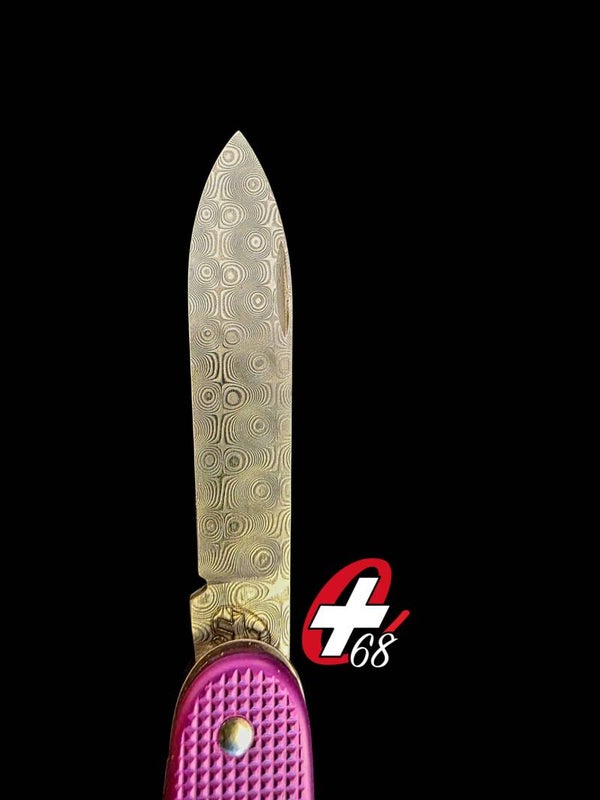 Victorinox Pioneer Mod Violette mit Damastklinge. Die Schalen wurden neu eloxiert.